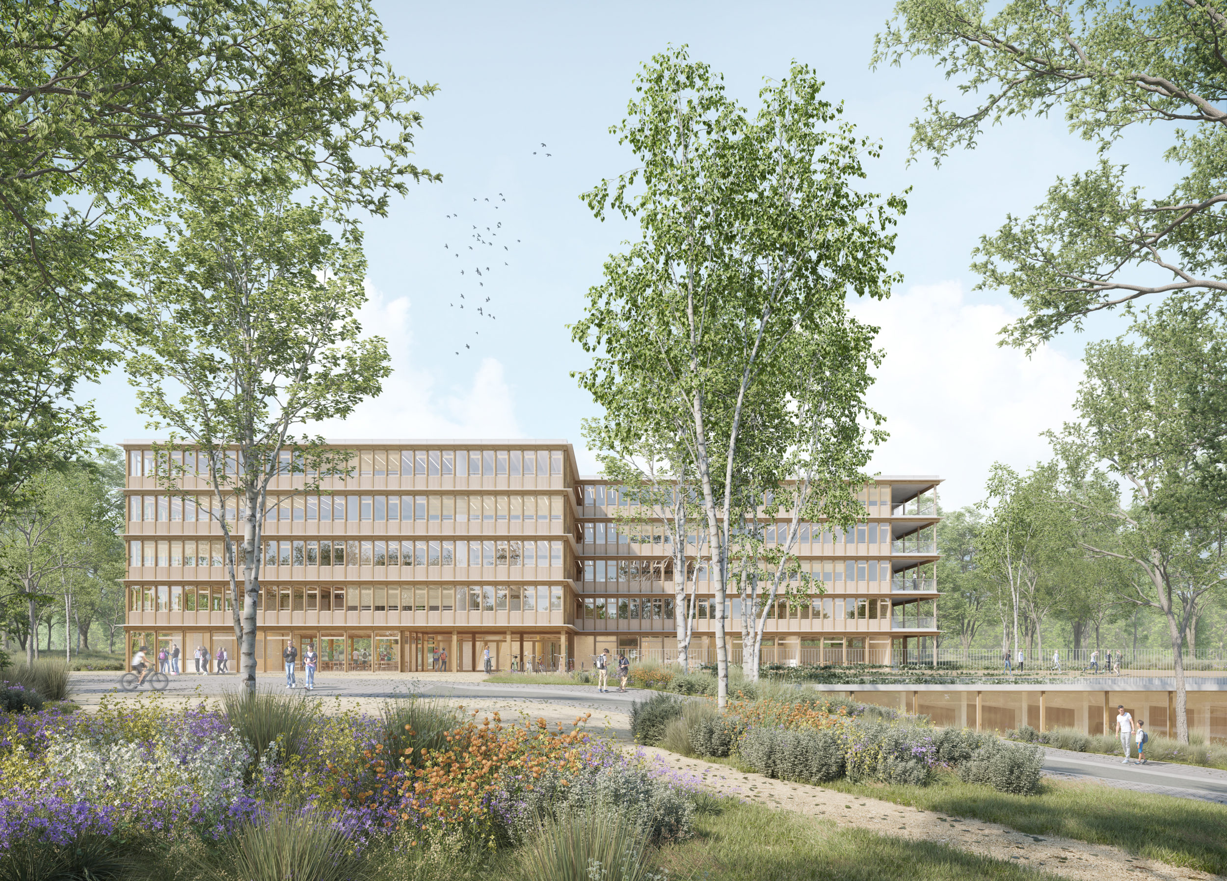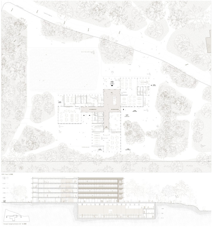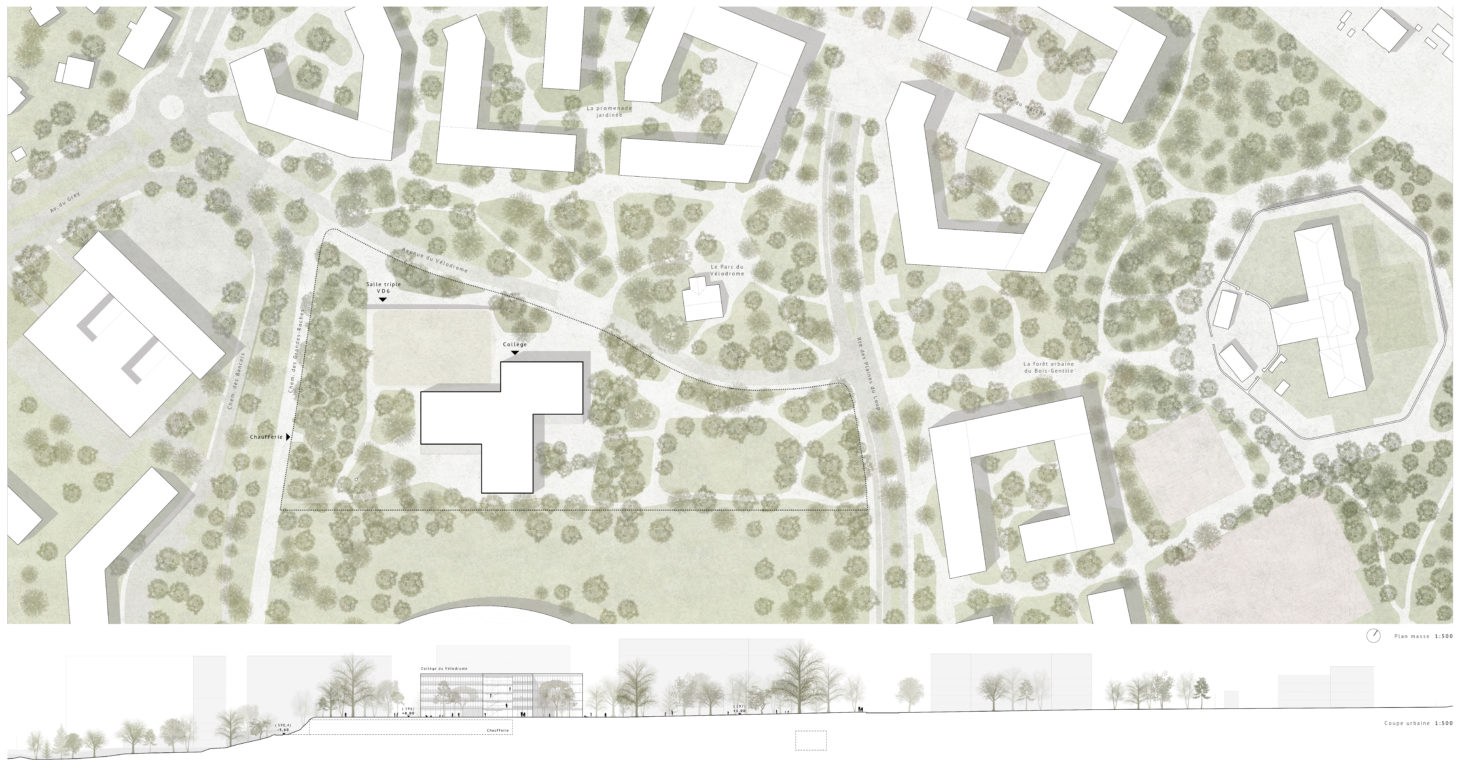 À partir d’une forme compacte et articulée, le projet s'implante dans le périmètre du concours comme un volume s’intégrant dans la continuité du parc du Vélodrome. La compacité du volume proposé en R+4 poptimise l’emprise au sol et libère de généreux espaces en pleine terre, propices au développement d’un écosystème riche et diversifié.