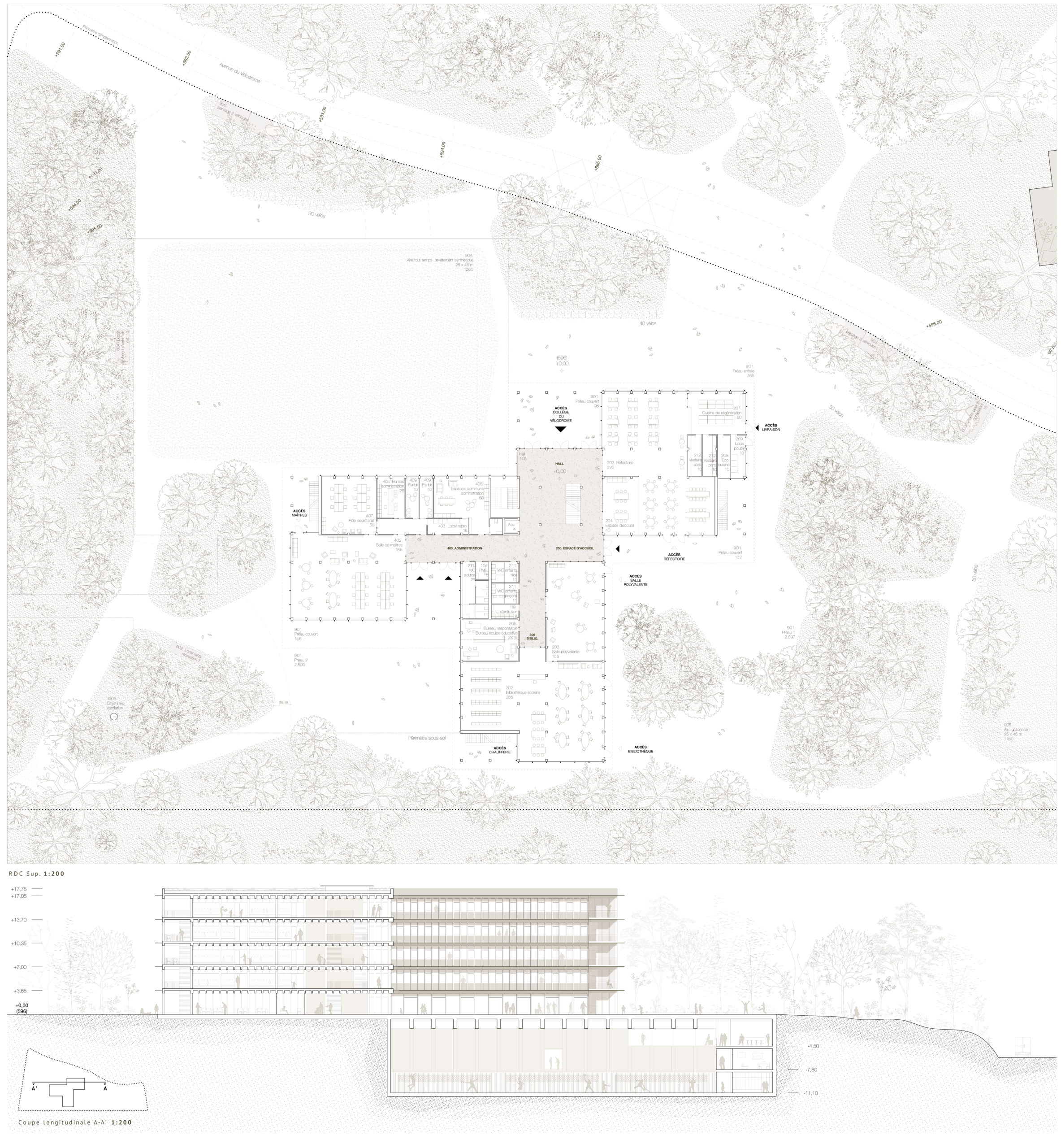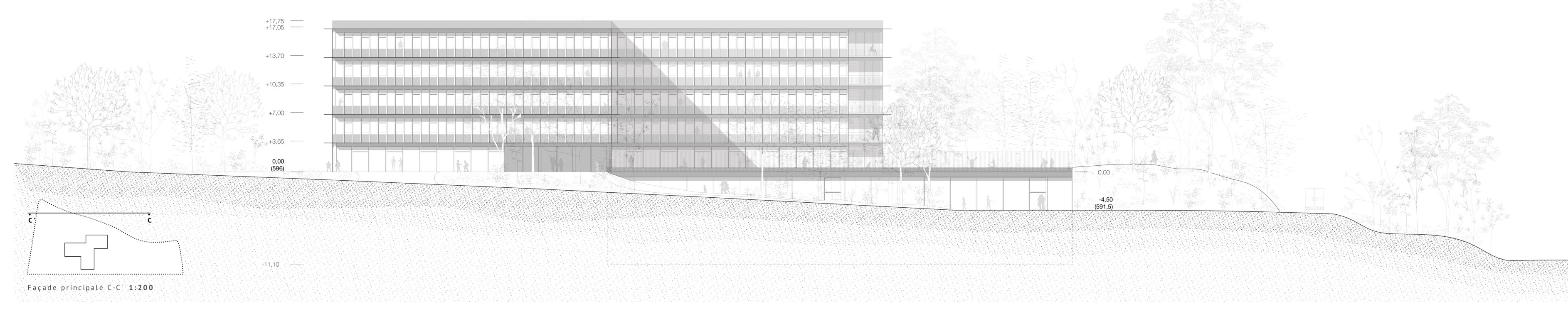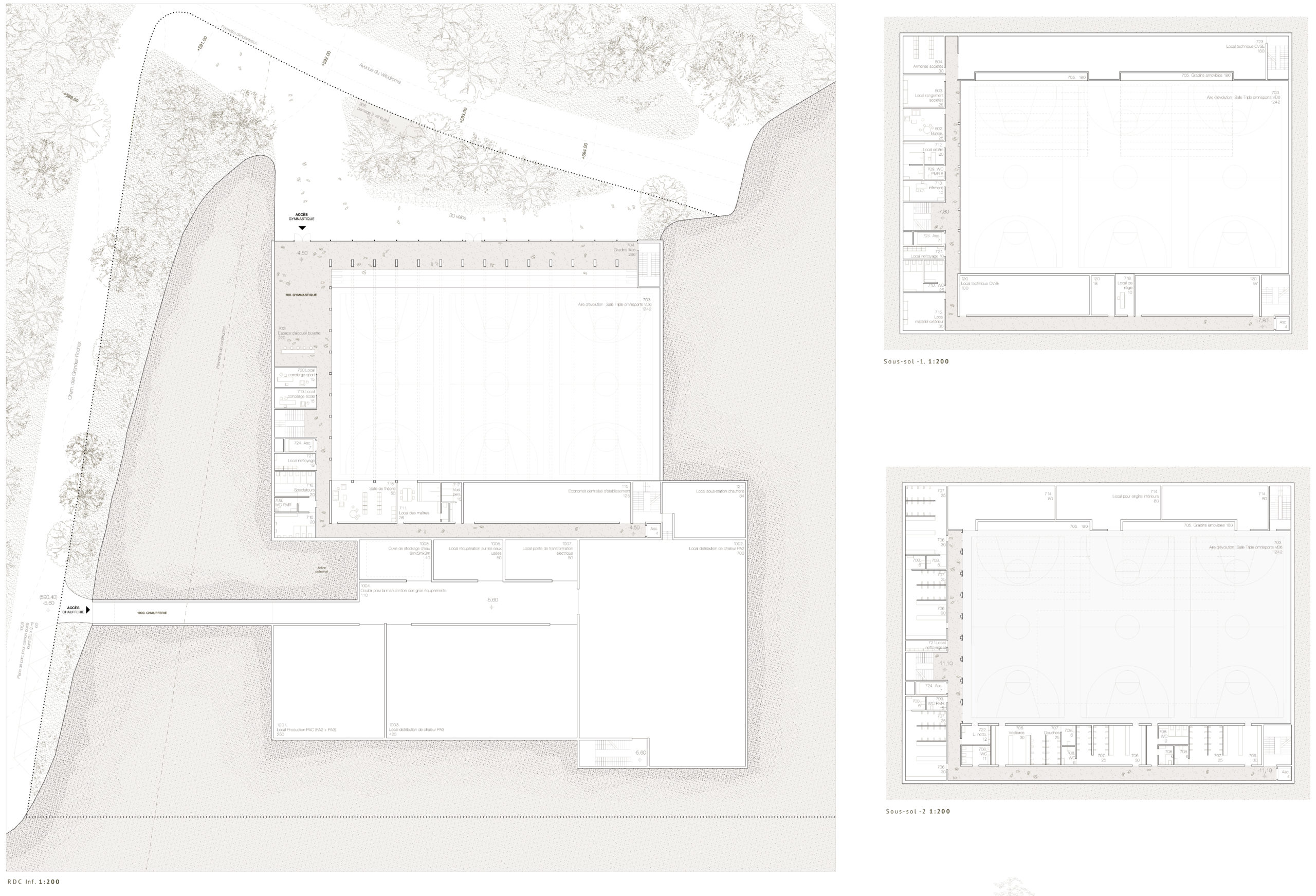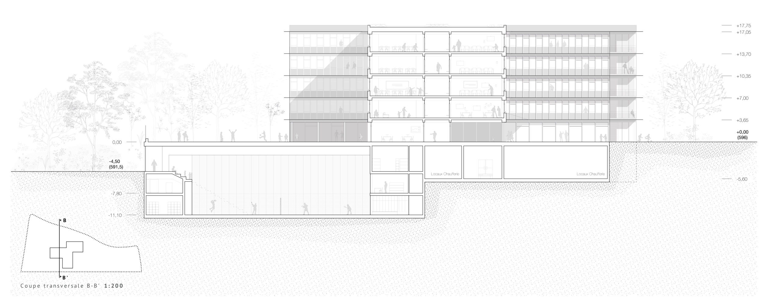 Le projet exploite pleinement la topographie du site en tirant parti du dénivelé entre la partie basse de l’Avenue du Vélodrome et le plateau supérieur. La salle de gym se positionne comme un volume semi-enterré en face du parc du Vélodrome. Cette proximité favorise l’utilisation partagée de cette salle entre l’école et les usagers externes. Un parvis d’accès extérieur pour les spectateurs est défini au niveau +591,5 m. Au-dessus de la salle, au niveau +596 m, se trouve la piste de sport synthétique, semblable à une place élevée offrant une vue panoramique sur le parc. A ce même niveau, qui correspond à la partie haute de l’Avenue du Vélodrome et du parc, se trouve l’école, permettant ainsi les accès de plain-pied depuis la « Place du Loup ».