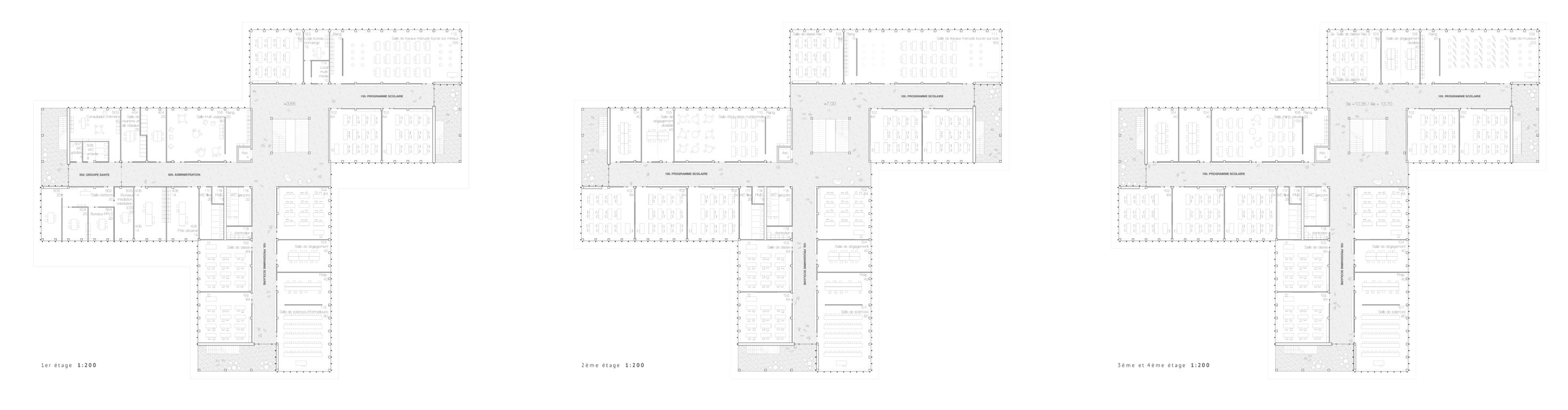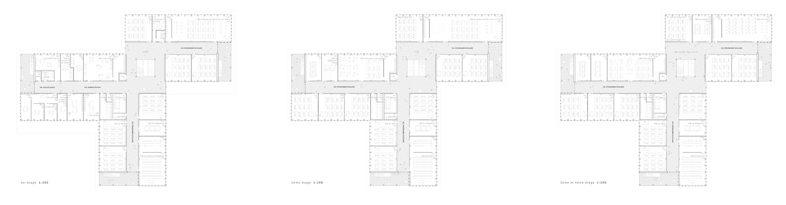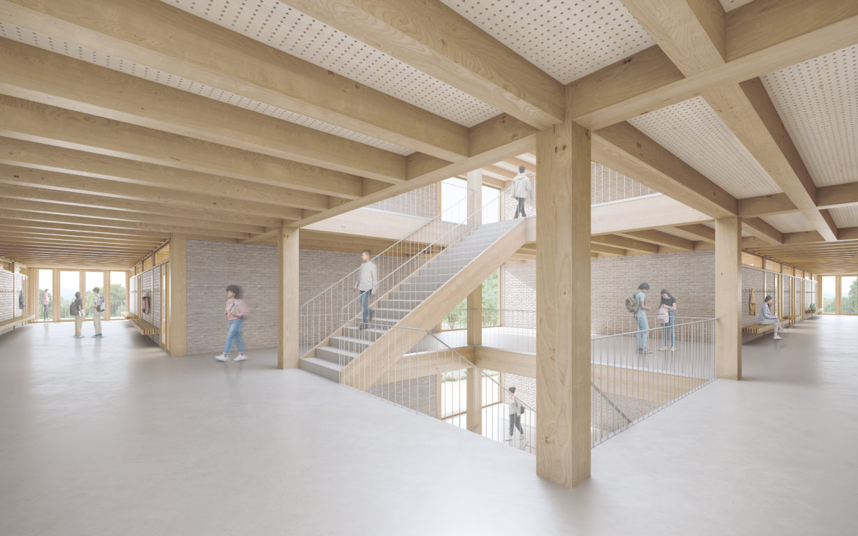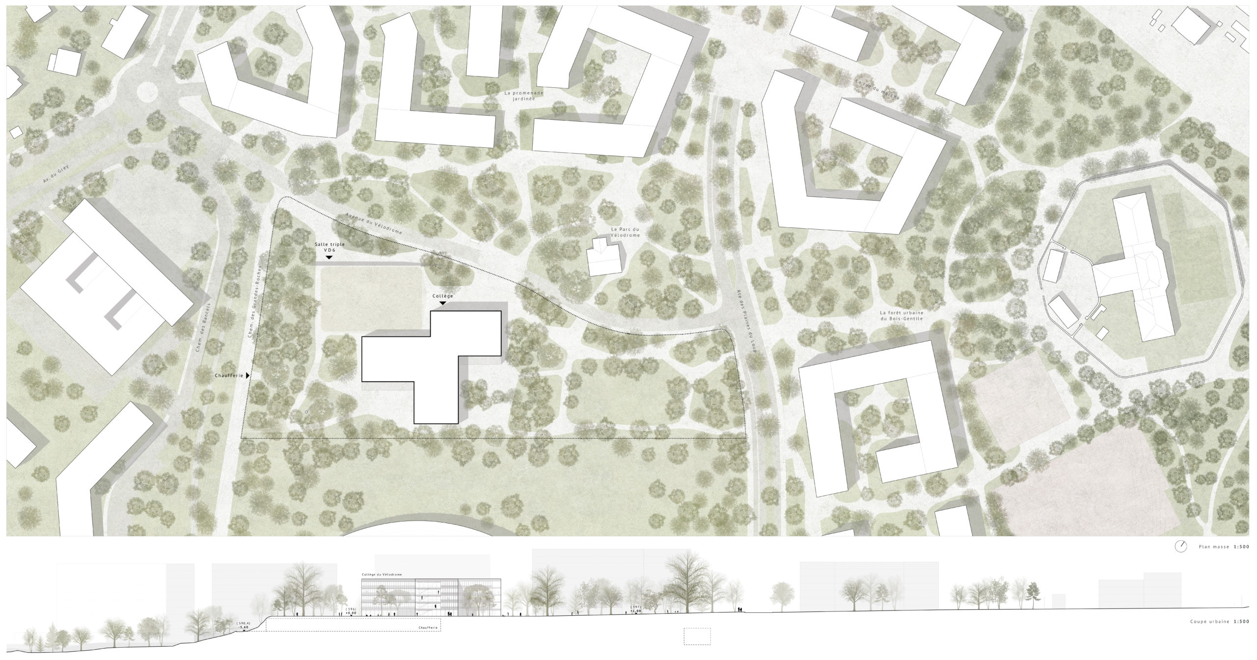 Le bâtiment occupe la zone centrale de la parcelle, tandis que les abords s’inscrivent dans la continuité des aménagements extérieurs du parc du Vélodrome. Sur la limite nord, les terrains de sport – couverts et extérieurs – s’articulent de manière à permettre un usage partagé entre les élèves et le public en dehors des horaires scolaires. Au sud de la parcelle, les «ailes» de la volumétrie dessinent des espaces plus protégés, formant deux zones de préaux distinctes, adaptées aux différents âges des élèves et intégrées au parc.