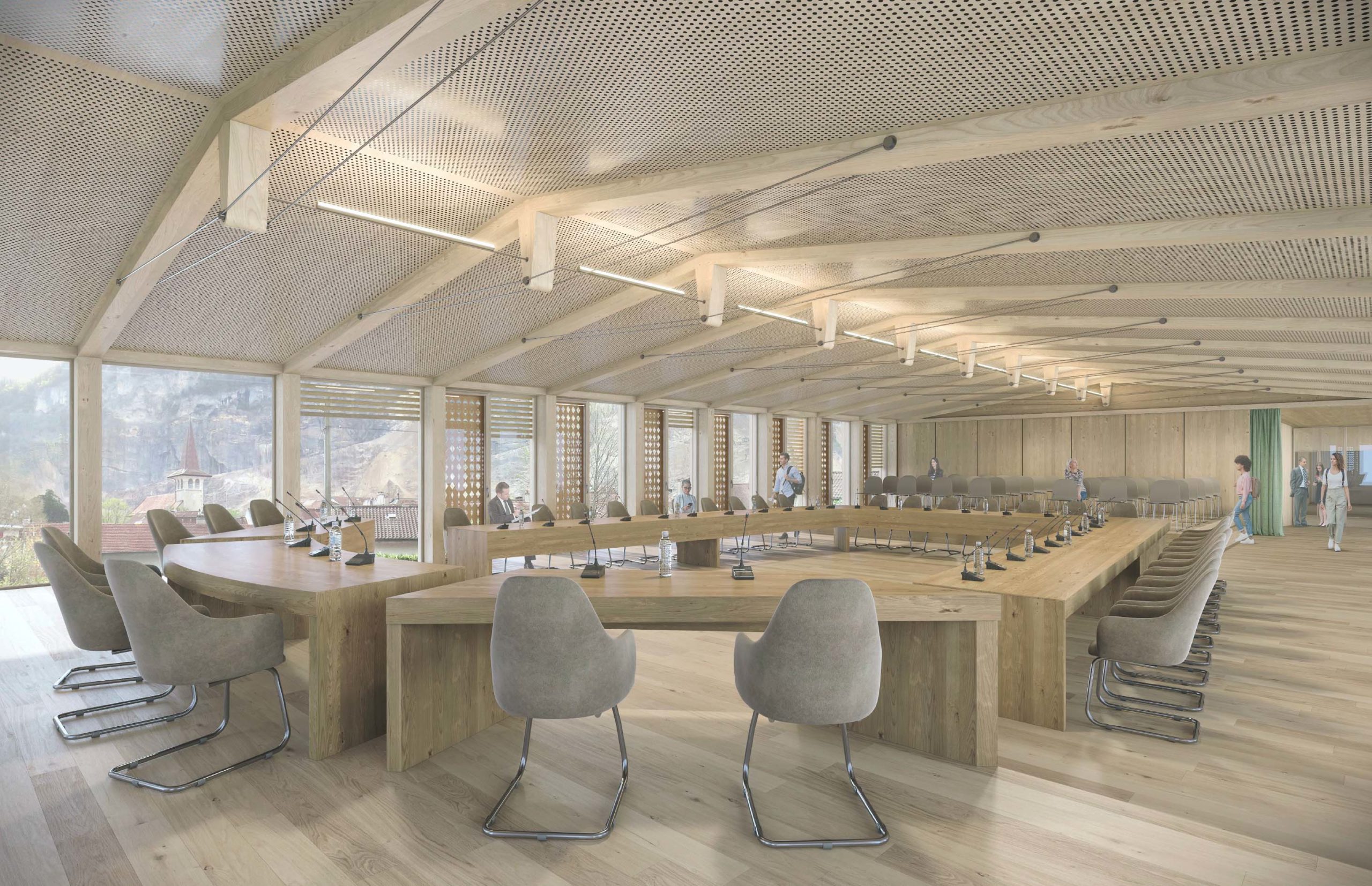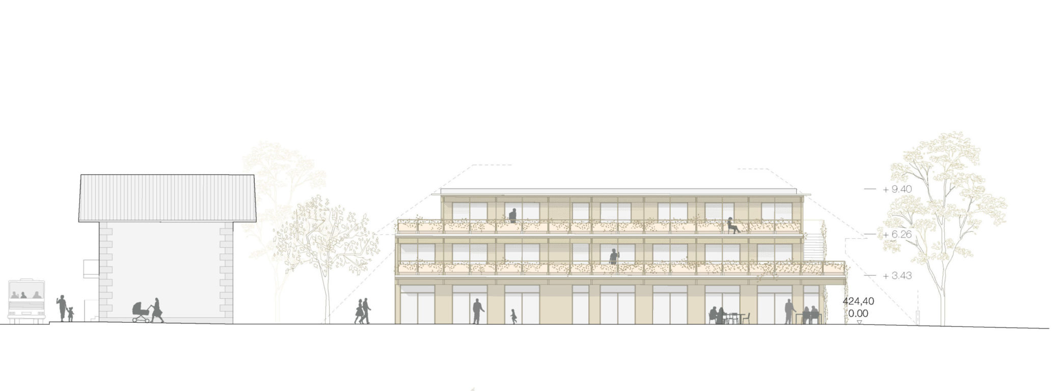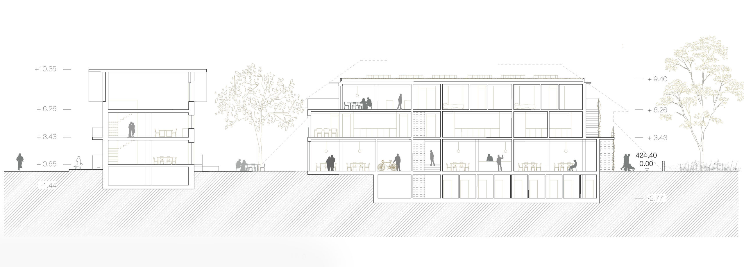 Les bâtiments actuels de la Villa Prins et d’équipements communaux sont des témoins de la cohérence architecturale du centre du Village de Veyrier. Le projet propose un espace de transition entre les langages architecturaux historiques (en zone 4B protégée) et des nouveaux édifices construits à proximité. De même, le dialogue entre la place des bâtiments communaux récents situés en face et la nouvelle place créée renforcera les synergies entre les programmes et la continuité urbaine sur la route de Veyrier. Le résultat architectural se base en une réponse rationnelle qui combine des transparences et des opacités en façade ainsi que des solutions de toitures adaptées aux bâtiments historiques et récents – toiture à double pente pour l’annexe du bâtiment communal et toiture plate pour les logements d’étudiants.