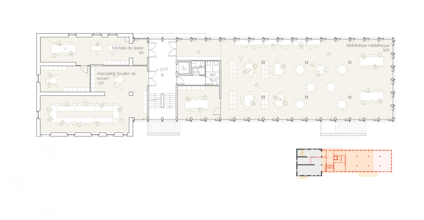 Le principe de transformation du bâtiment communal réside dans le fait de pouvoir doter ces espaces d’une capacité d’adaptation dans le futur. À cette fin, le projet « Pile ou Face » s’inspire de l’essence propre des bâtiments ruraux, en créant des surfaces ouvertes et multifonctionnelles. Les espaces se situent autour d’une nouvelle cage de circulations verticales, libérant complètement le volume du bâtiment existant et produisant une grande surface devant le parc. Ces deux grands espaces pourront donc un jour se transformer facilement pour accueillir d’autres programmes. En face, se situe le programme des logements d’étudiants qui proposent, à partir de typologies traversantes, un lien fort entre les espaces intérieurs et extérieurs. Ainsi, une coursive définit à la fois une surface ouverte de circulation et de détente où les habitants pourront créer un espace de partage en vis-à-vis avec l’espace urbain. De la même façon que la place sera dynamisée par les surfaces commerciales du rez- de-chaussée, l’espace commun situé au 2e étage permettra de créer une « place en toiture » pour les habitants.