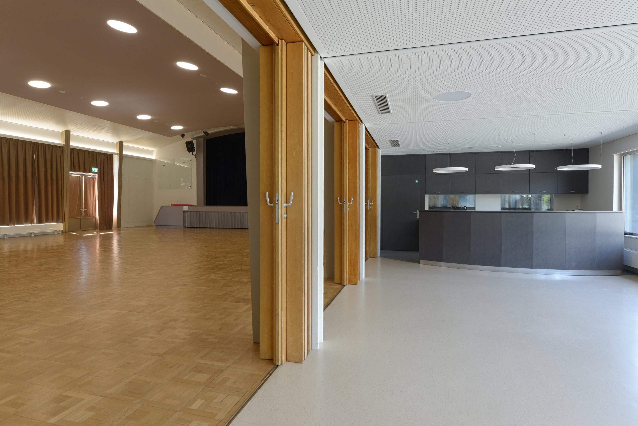 Les zones d’entrée et de cuisine/buvette ont été réaménagées pour offrir plus de confort aux utilisateurs. La salle de spectacle a été rénovée et modernisée en respectant la nature du projet original de 1956 de l’architecte Arthur Bugna. Le premier étage a été transformé entièrement avec des salles de réunion. Les installations techniques du bâtiment ont été remplacées et l’enveloppe thermiques entièrement revue.